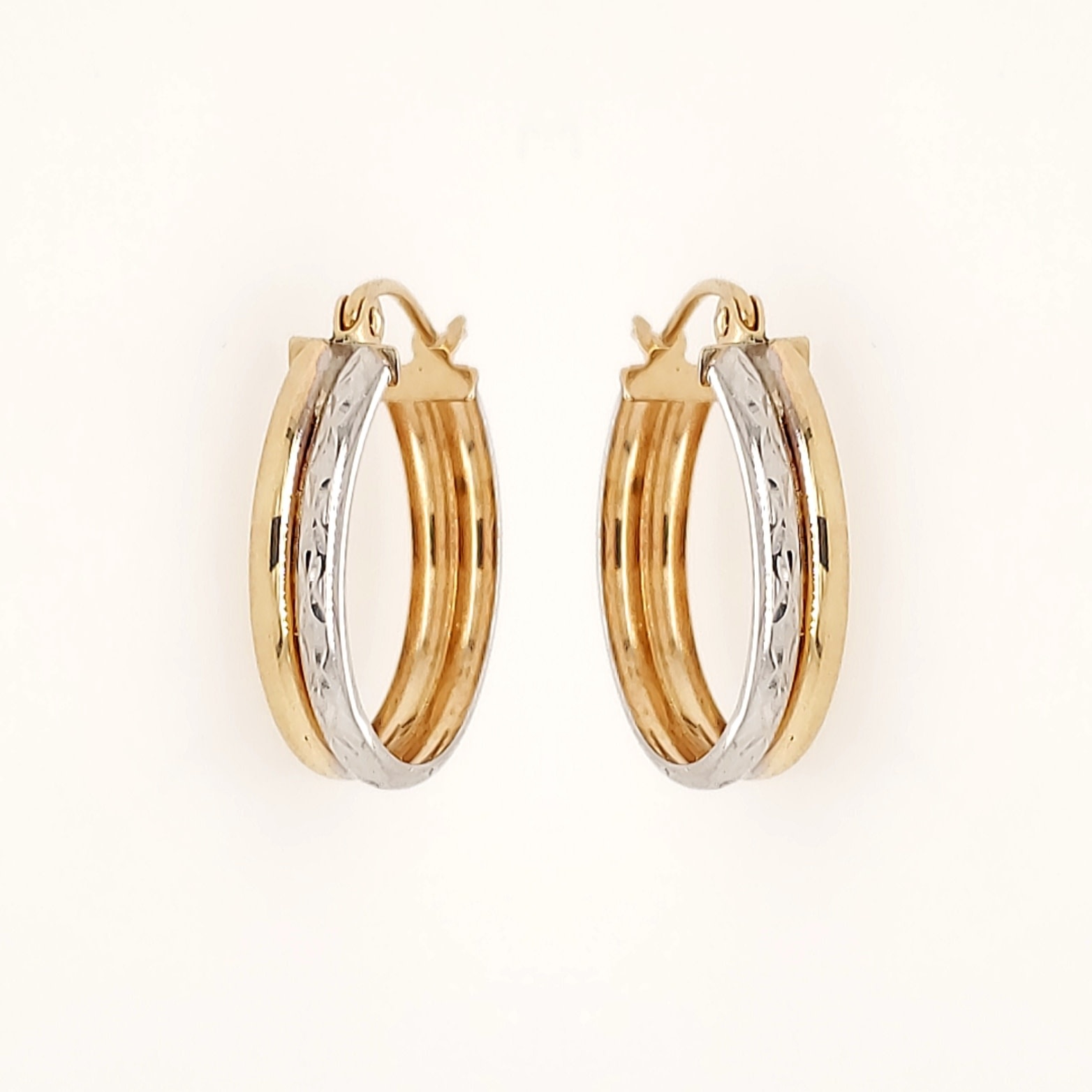 14K TWO TONE 0.75" 4MM HIGH POLISH AND DIAMOND CUT DOUBLE OVAL SMALL HOOPS
