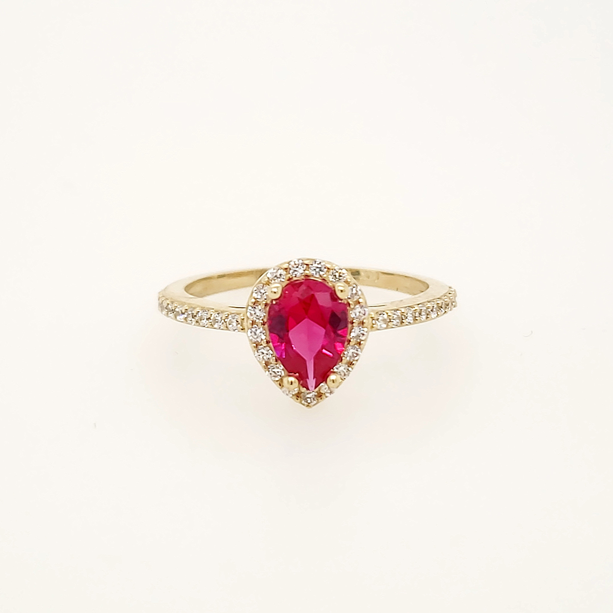 14K YELLOW GOLD PEAR SHAPE RED CUBIC ZIRCONIA HALO LADIES RING