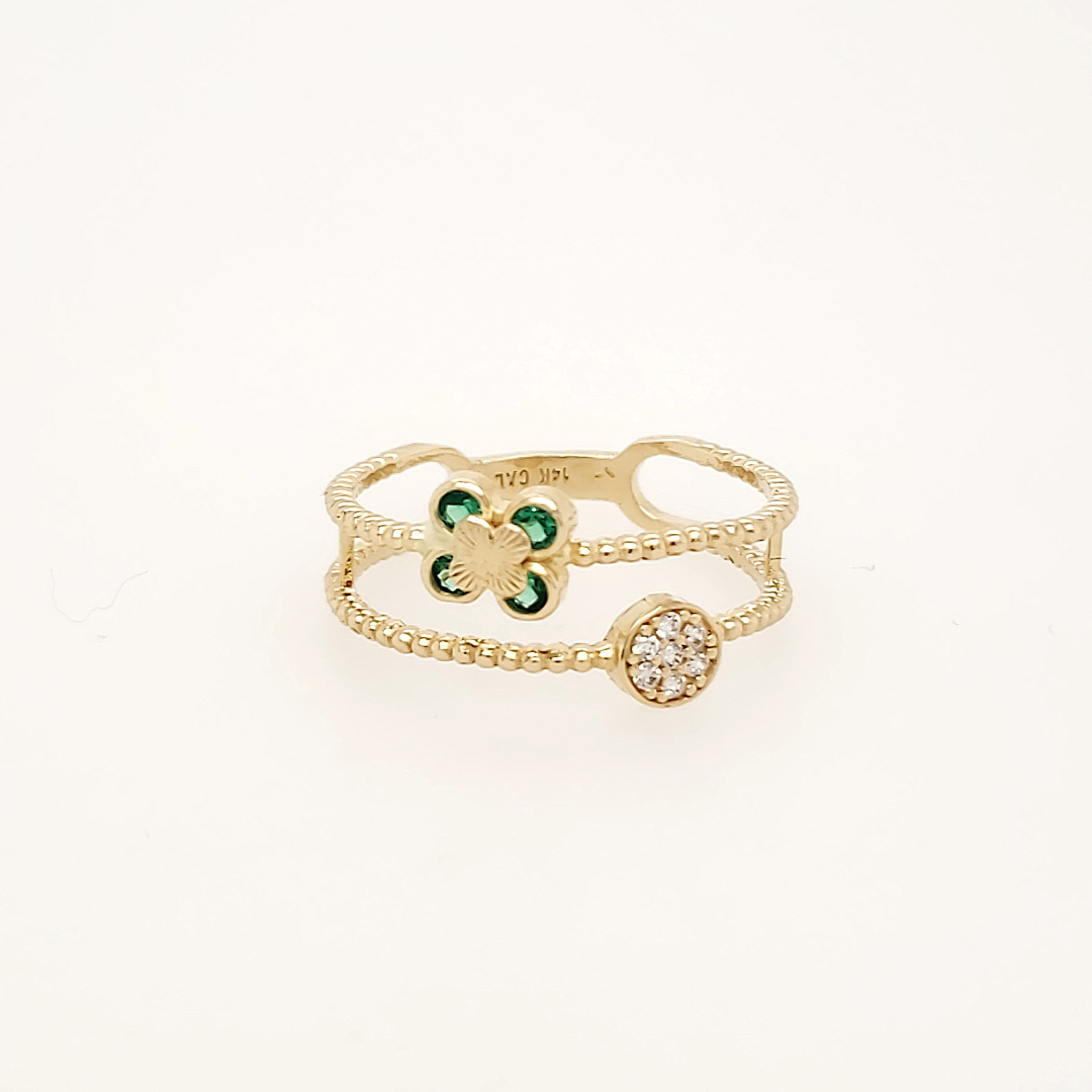 14K YELLOW GOLD CUBIC ZIRCONIA DISC GREEN FLOWER BEADED SPLITED BADN STACKABLE LADIES RING