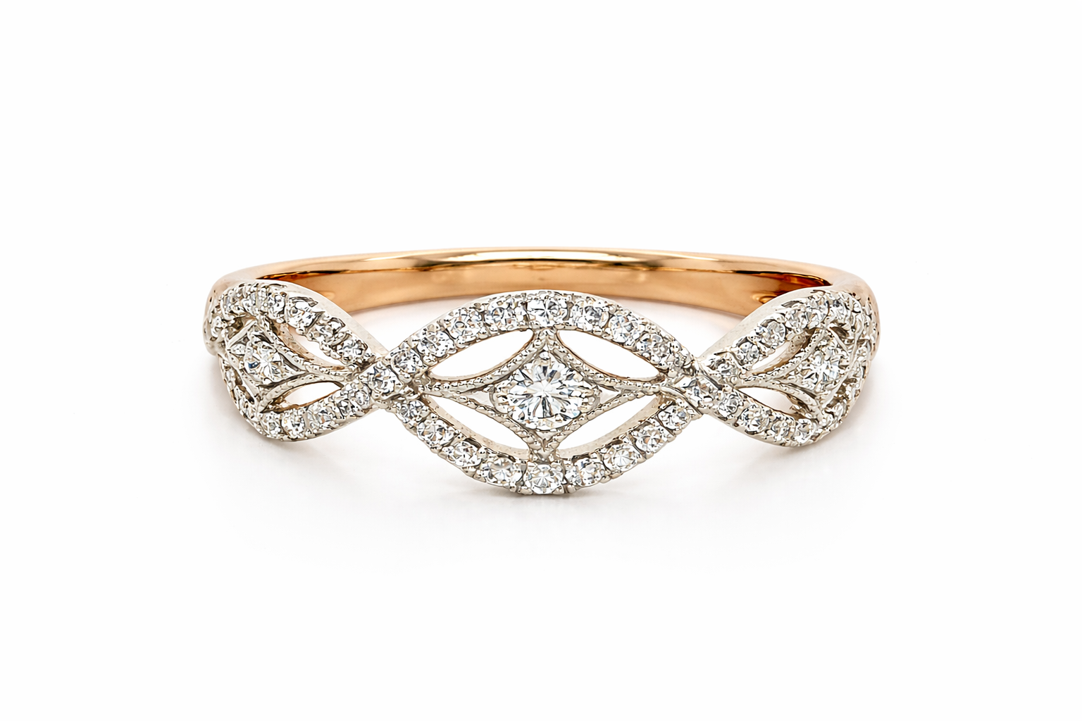 18K. ROSE AND WHITE GOLD .40CT DIAMOND INFINITY STYLE LADIES RING