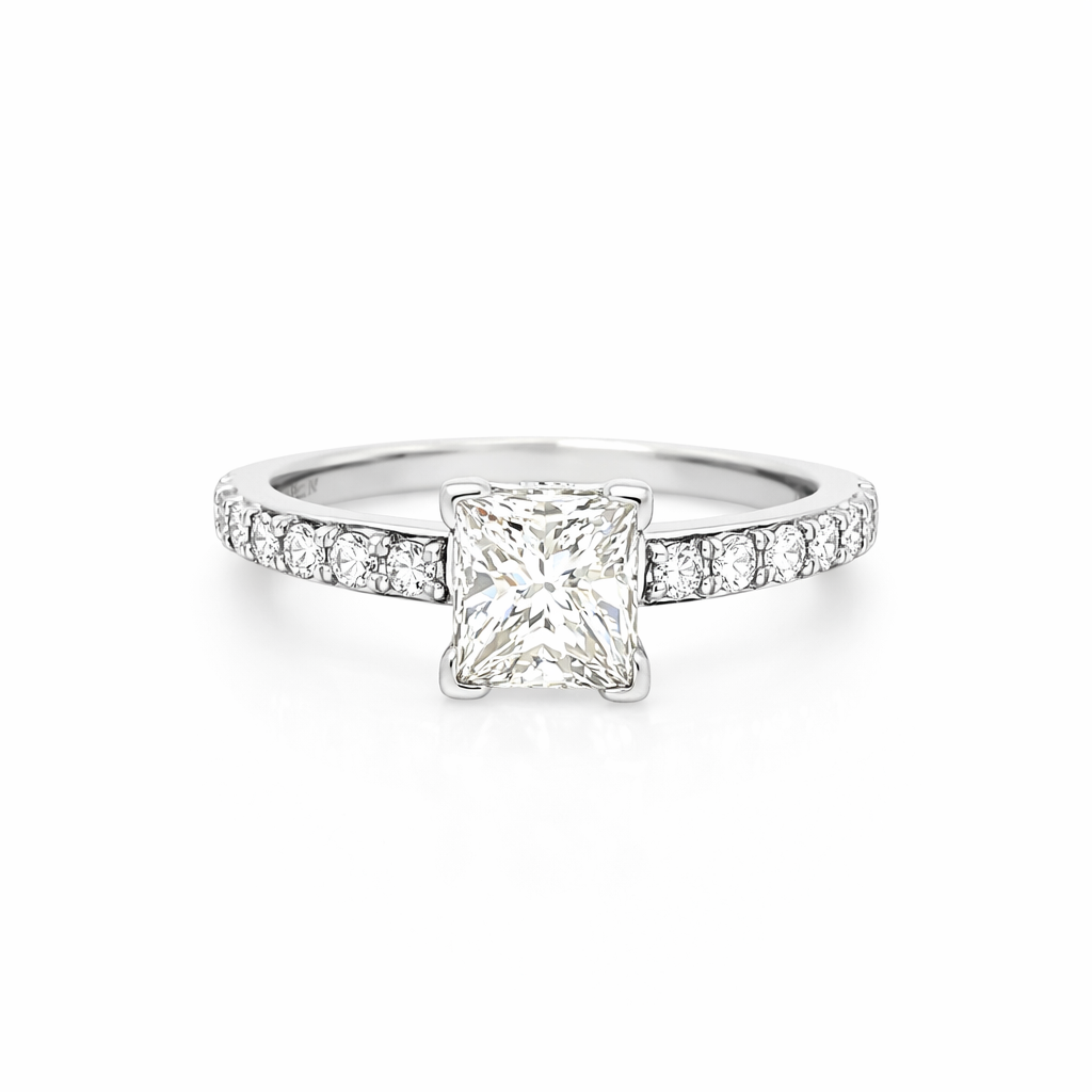 14K WHITE GOLD 1.07 CT I VS2 PRINCESS CUT DIAMOND CENTER WITH COMMON PRONG CHANNEL SET ENGAGEMENT RING