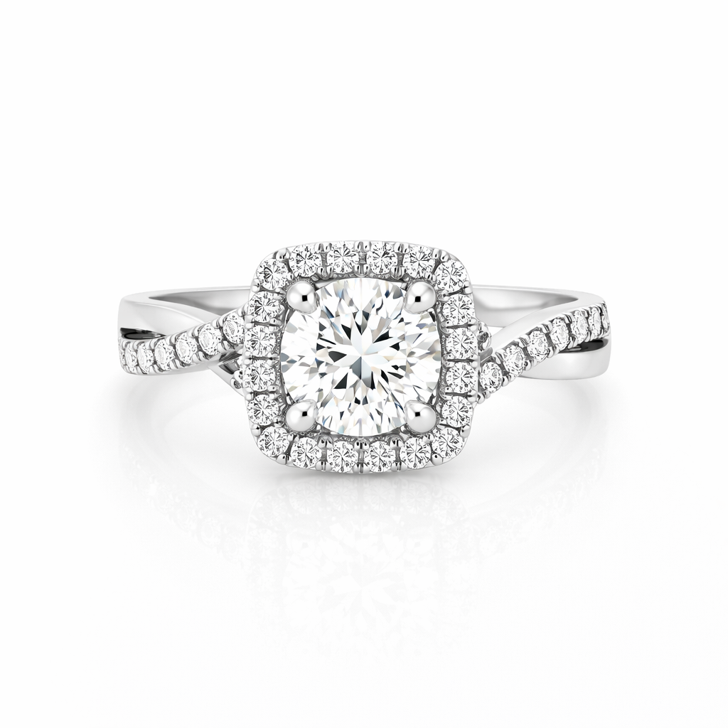 476586 18K WHITE GOLD .56TCW H SI1 ROUND DIAMOND CENTER CUSHION HALO .23TCW TWISTED SHANK DESIGN ENGAGEMENT RING