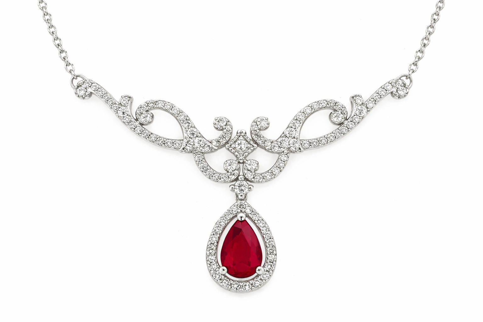 60011 10K WHITE GOLD PEAR SHAPE RUBY WITH .60TCW DIAMOND VINTAGE STYLE FANCY NECKPIECE