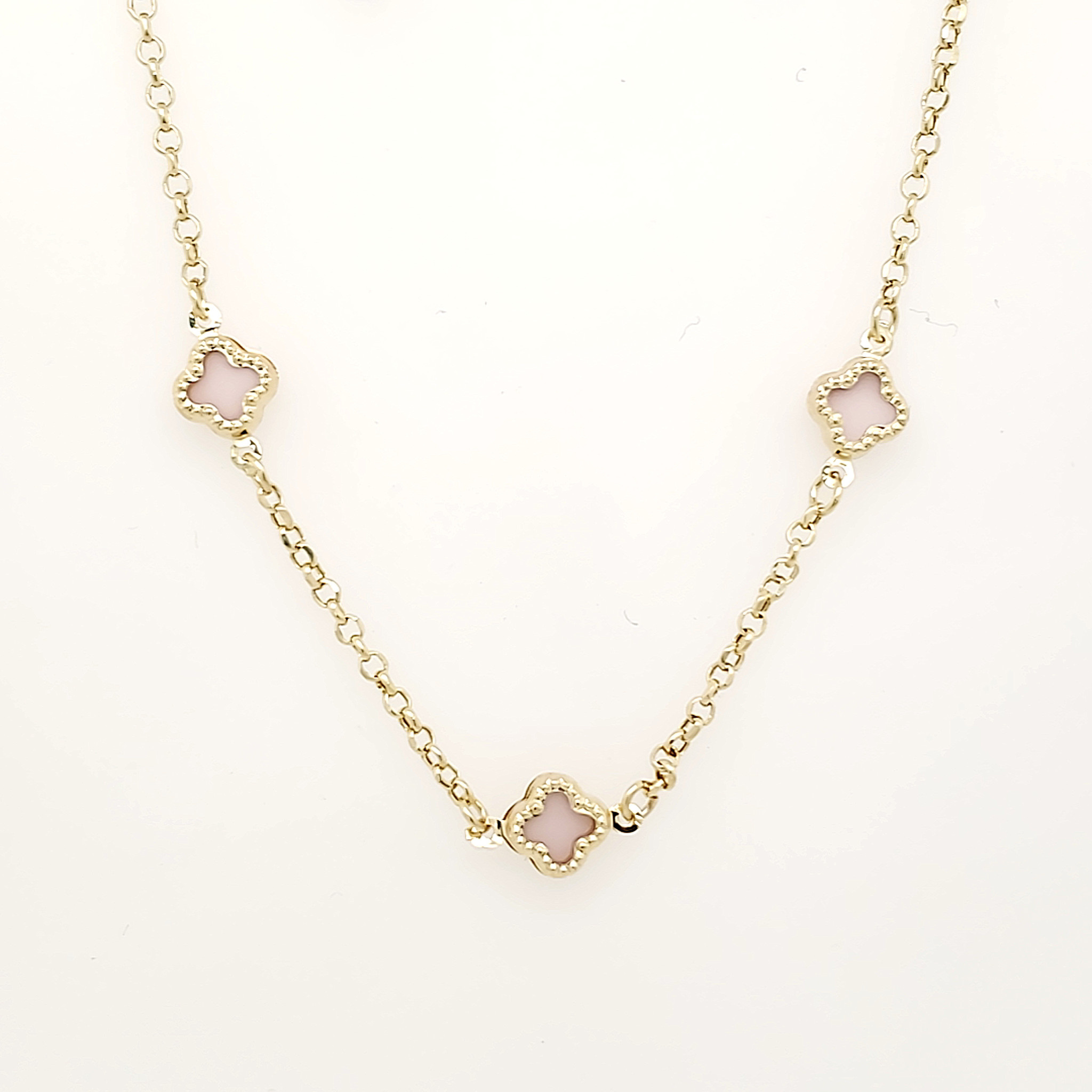14K YELLOW GOLD PINK CERAMIC MULTI CLOVER NECKPIECE