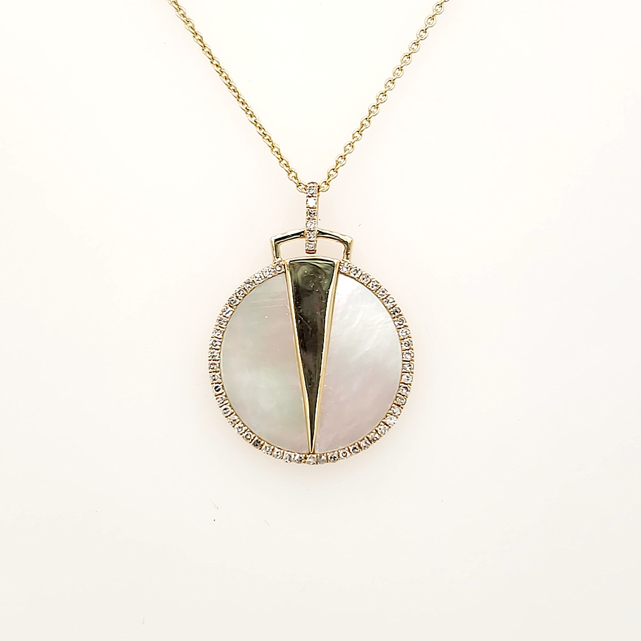 14K YELLOW GOLD .15CTW DIAMOND MOTHER OF PEARL ROUND HALO FASHION PENDANT NECKLACE