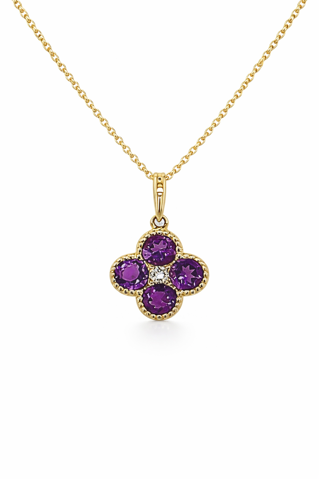 14K YELLOW GOLD .02CTW DIAMOND AMETHYST CLOVER SHAPE MILGRAIN PENDANT NECKLACE