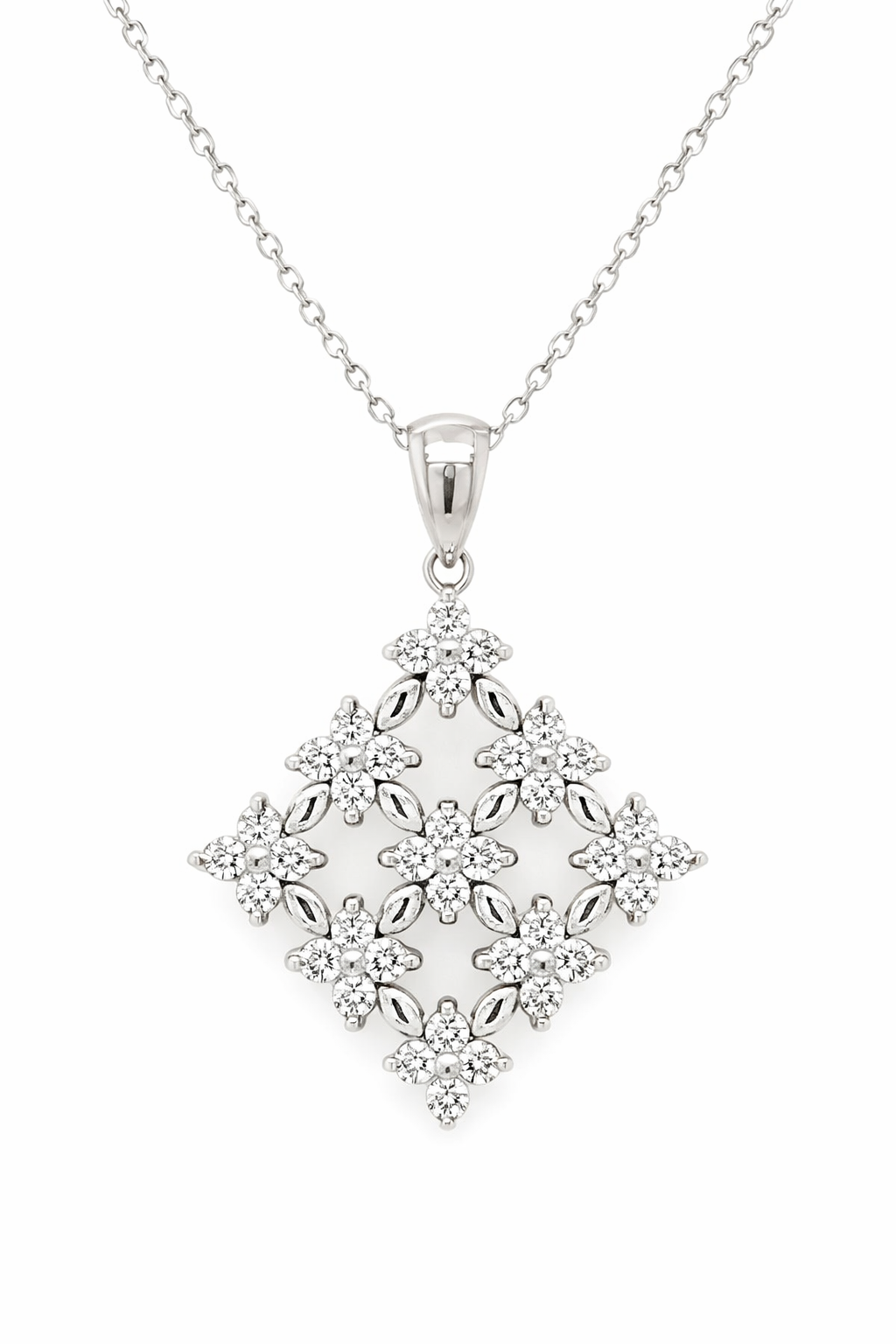 18K WHITE GOLD .75CTW DIAMOND RHOMBUS SHAPE FLORAL PENDANT WITH 14K WHITW GOLD CHAIN NECKLACE