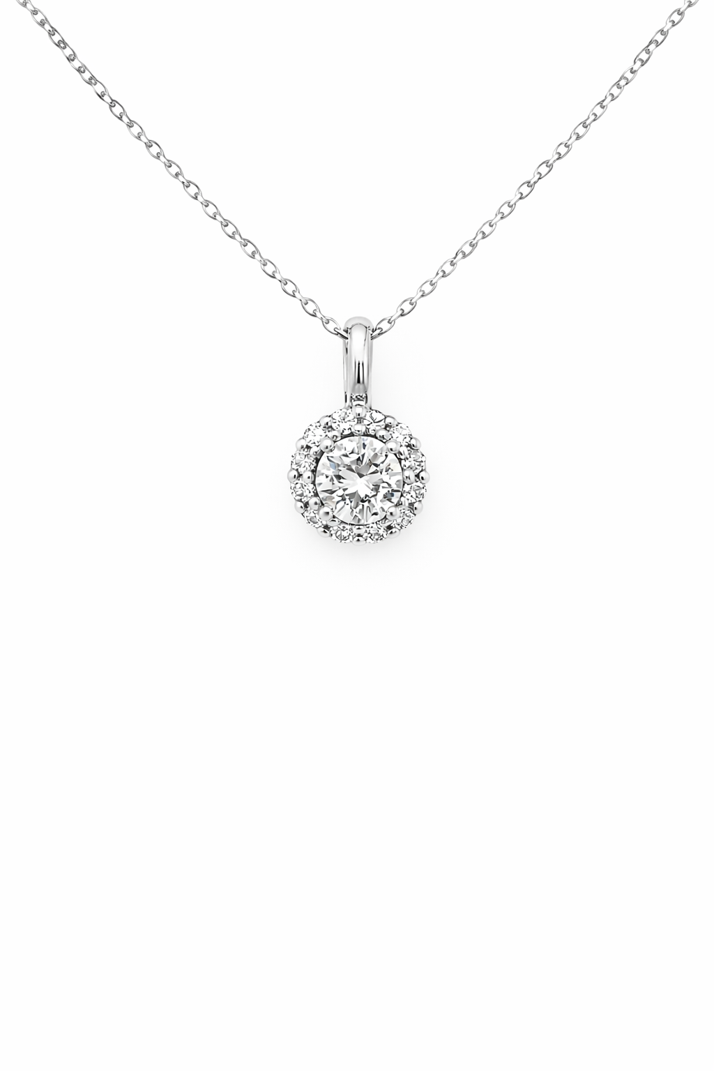 14K WHITE GOLD .56CT CENTER DIAMOND .24CT DIAMOND HALO PENDANT NECKLACE