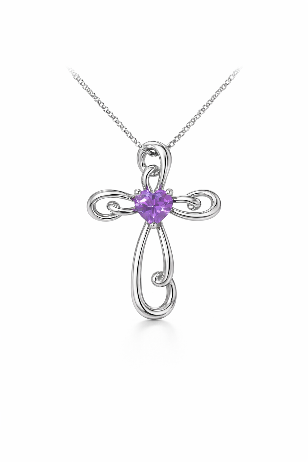 10K WHITE GOLD HEART SHAPE AMETHYST CENTER HIGH POLISH FANCY CROSS PENDANT NEKCLACE
