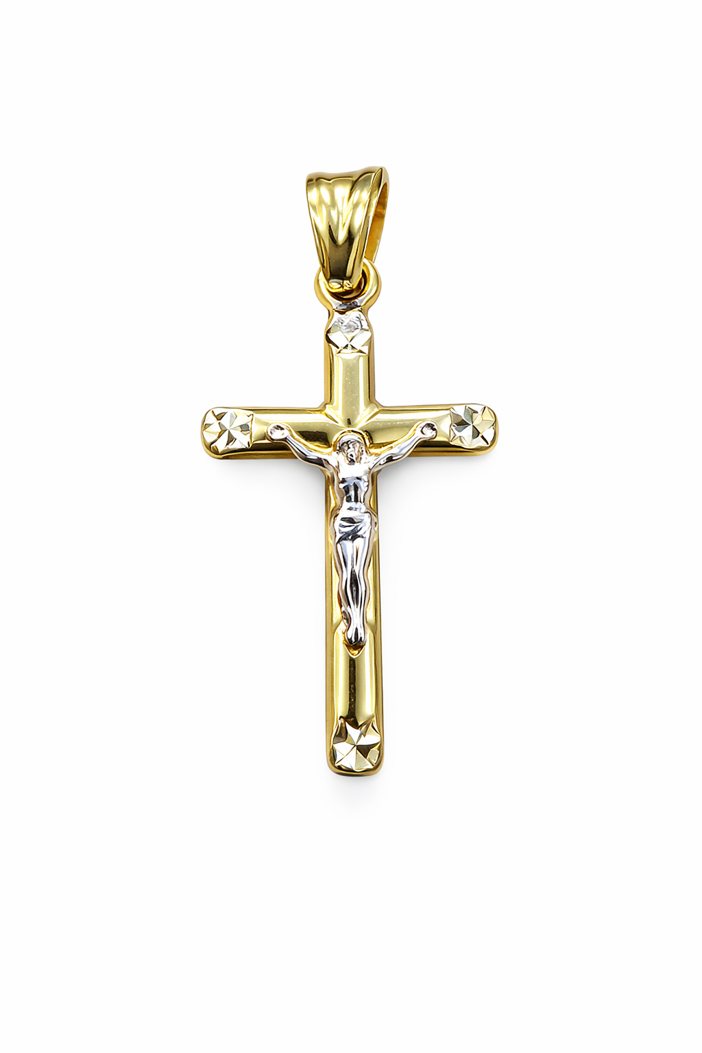 14K TWO TONE 1.35" HIGH POLISH DIAMOND CUT TIPS CRUCIFIX CHARM